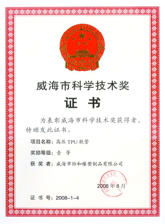 熱烈祝賀我公司高壓TPU軟管項目榮獲威海市科技進步一等獎